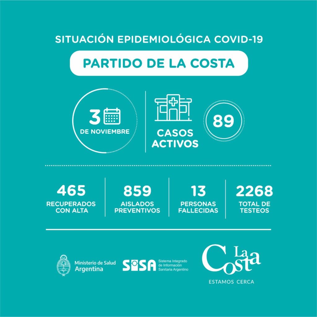 Este martes 3 de noviembre se han recuperado otros 21 vecinos y vecinas de Covid-19 en el Partido de La Costa. Se recibieron resultados de un total de 49 testeos, de los cuales 38 son negativos y 11 son positivos.