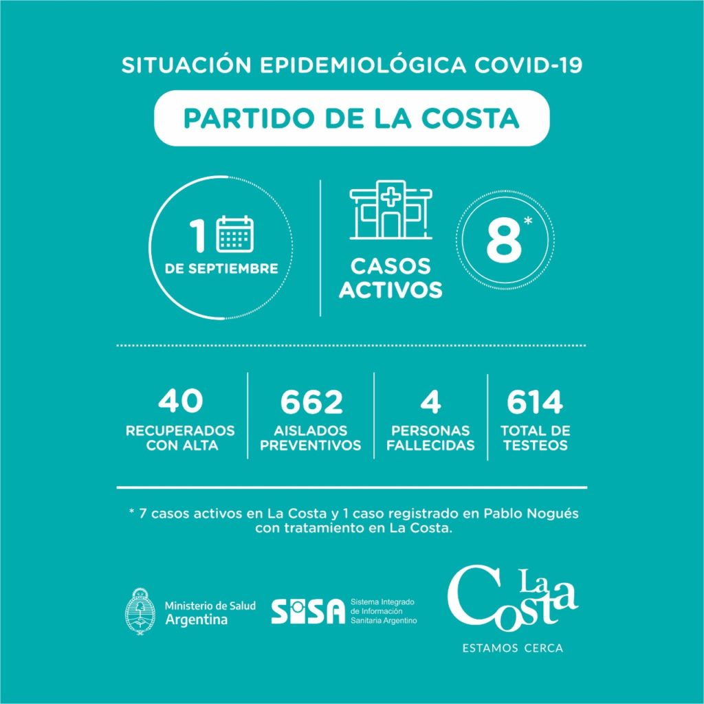 En el Partido de La Costa tenemos, al día de hoy, 8 casos activos, 7 de ellos registrados en el distrito, y 1 en Pablo Nogués con tratamiento en La Costa, más 40 costeros y costeras que ya recibieron el alta médica. Sin bien las cifras, considerando nuestra cantidad de habitantes, son auspiciosas, insistimos con el pedido de la responsabilidad individual.