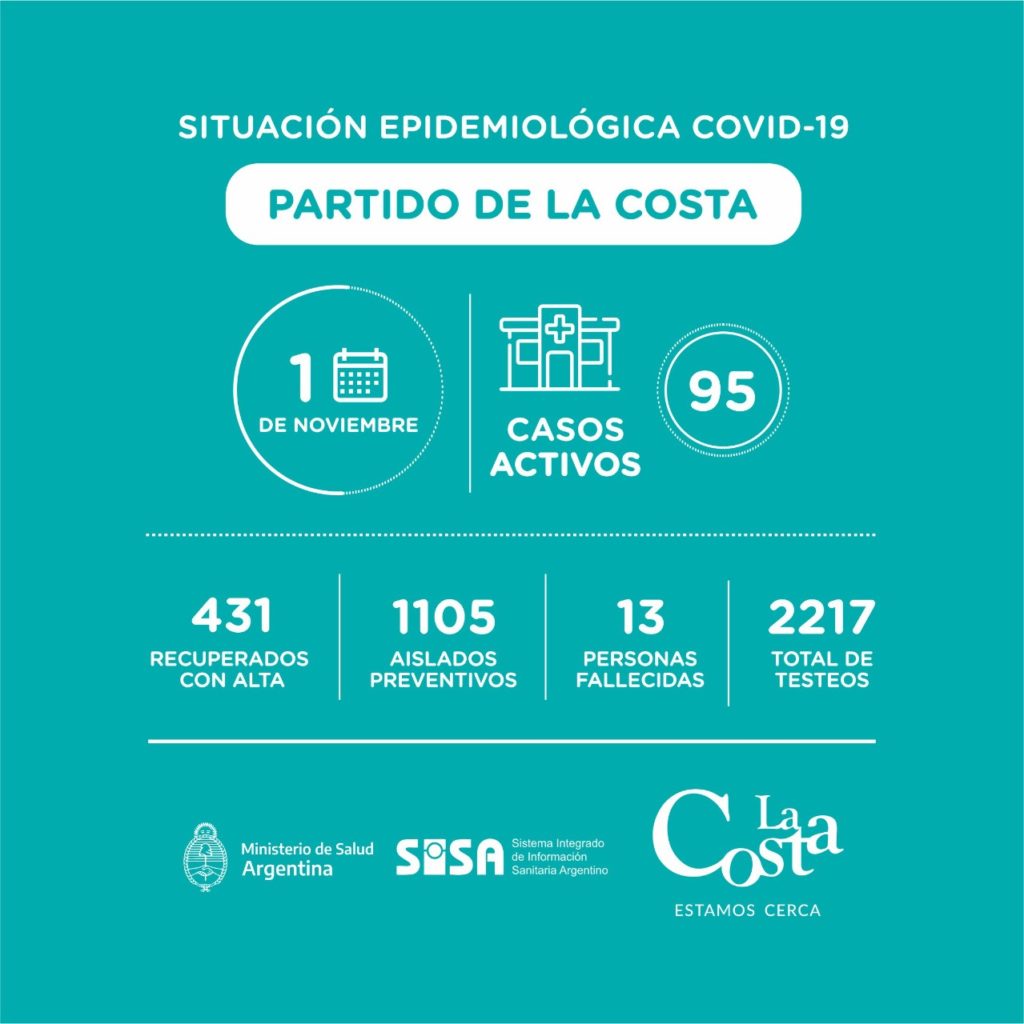 Este domingo 1 de noviembre se han recuperado otros 13 vecinos y vecinas de Covid-19 en el Partido de La Costa. Se recibieron resultados de un total de 55 testeos, de los cuales 39 son negativos y 16 son positivos.