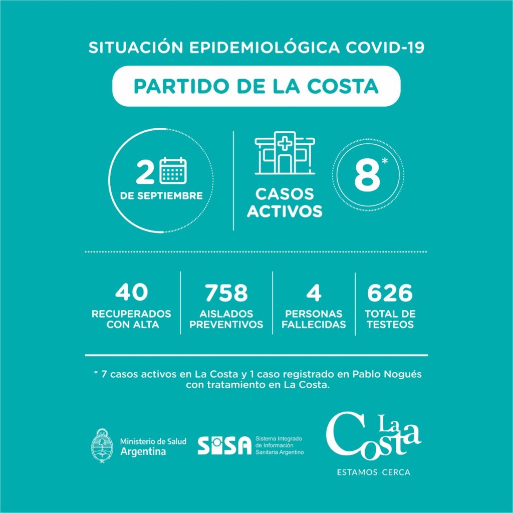 Recordamos que al día de hoy tenemos 8 casos activos, 7 de ellos registrados en el distrito, y 1 en Pablo Nogués con tratamiento en La Costa, más 40 costeros y costeras que ya recibieron el alta médica.