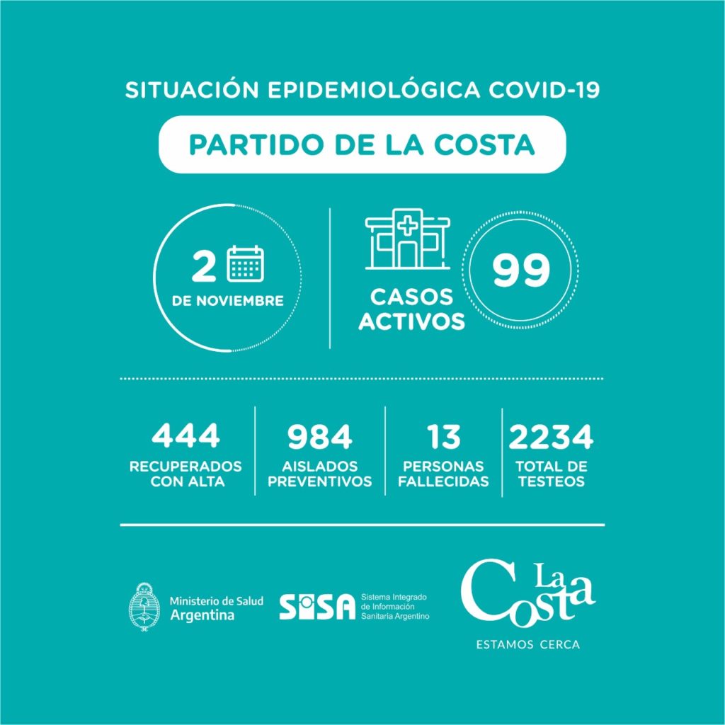 Este lunes 2 de noviembre se han recuperado otros 13 vecinos y vecinas de Covid-19 en el Partido de La Costa. Se recibieron resultados de un total de 64 testeos, de los cuales 47 son negativos y 17 son positivos.