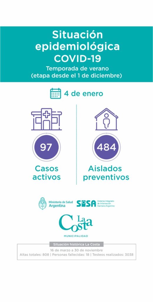 Es por eso que al día de hoy tenemos entonces 97 casos activos entre los 100.000 habitantes del Partido de La Costa, y 1.008 vecinos y vecinas que ya han recibido el alta médica. Informamos también que ha fallecido por Covid-19 un vecino de Santa Teresita de 77 años de edad que había ingresado al Hospital de dicha localidad con una insuficiencia respiratoria severa.