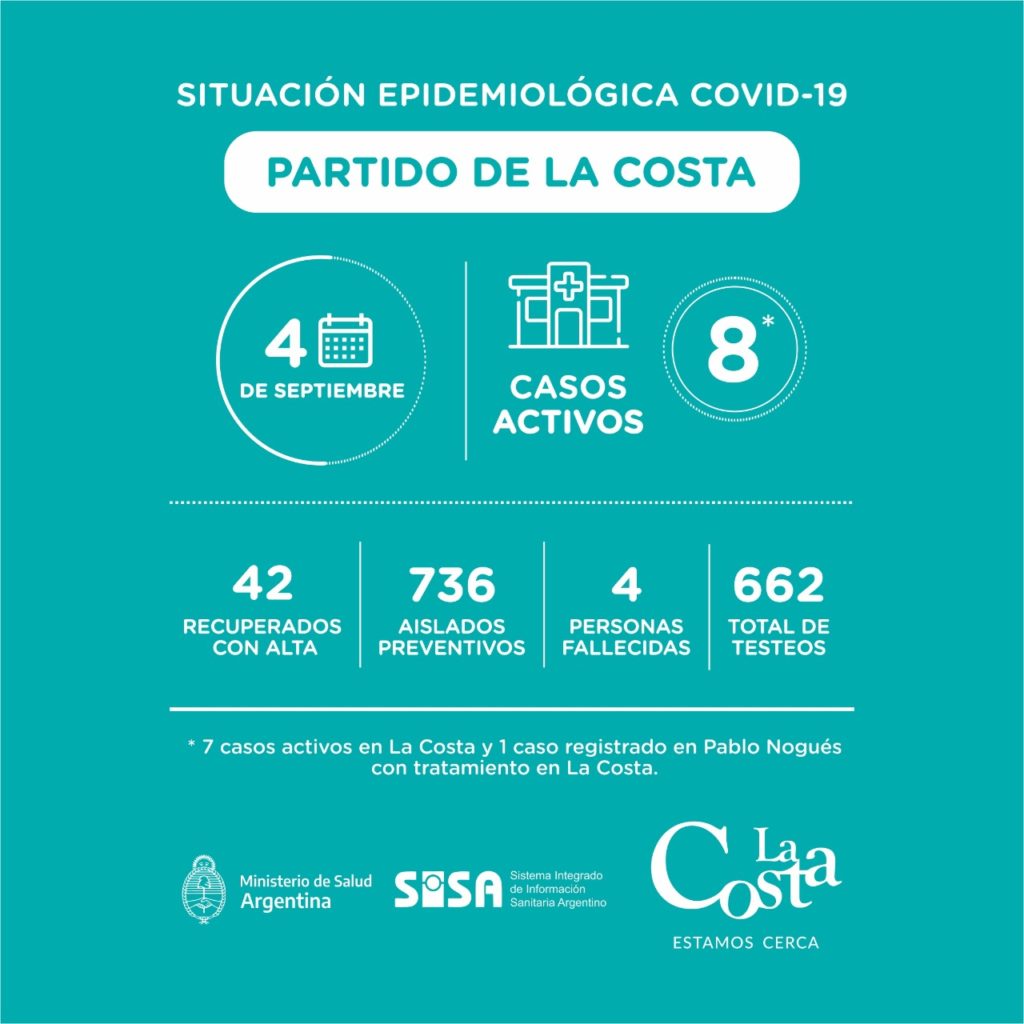 Recordamos que al día de hoy tenemos 8 casos activos, 7 de ellos registrados en el distrito, y 1 en Pablo Nogués con tratamiento en La Costa, más 42 costeros y costeras que ya recibieron el alta médica.