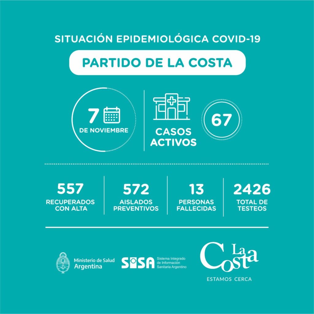 Este sábado 7 de noviembre se han recuperado otros 20 vecinos y vecinas de Covid-19 en el Partido de La Costa. Se recibieron resultados de un total de 55 testeos, de los cuales 42 son negativos y 13 son positivos.