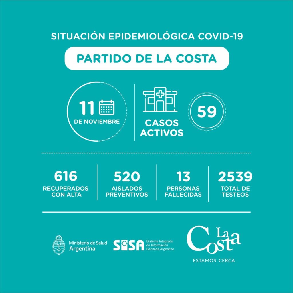 Este miércoles 11 de noviembre se han recuperado otros 12 vecinos y vecinas de Covid-19 en el Partido de La Costa. Se recibieron resultados de un total de 52 testeos, de los cuales 36 son negativos y 16 son positivos.