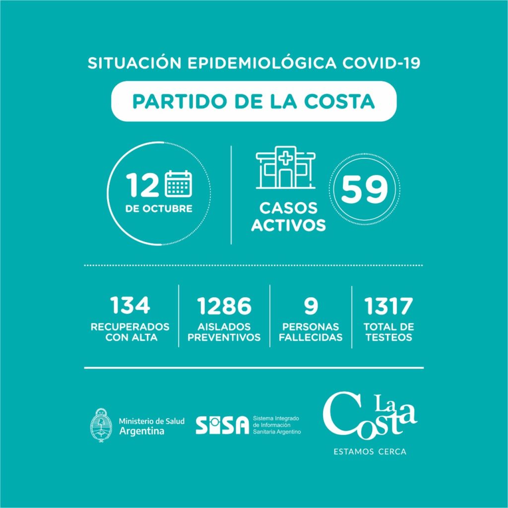 Entonces, al día de la fecha tenemos 59 casos activos entre los 100.000 habitantes del Partido de La Costa y 134 vecinos y vecinas que recibieron el alta médica. Les insistimos en el pedido de responsabilidad individual y colectiva. Les recordamos otra vez que están totalmente prohibidas las reuniones sociales, que son principales focos de contagios.