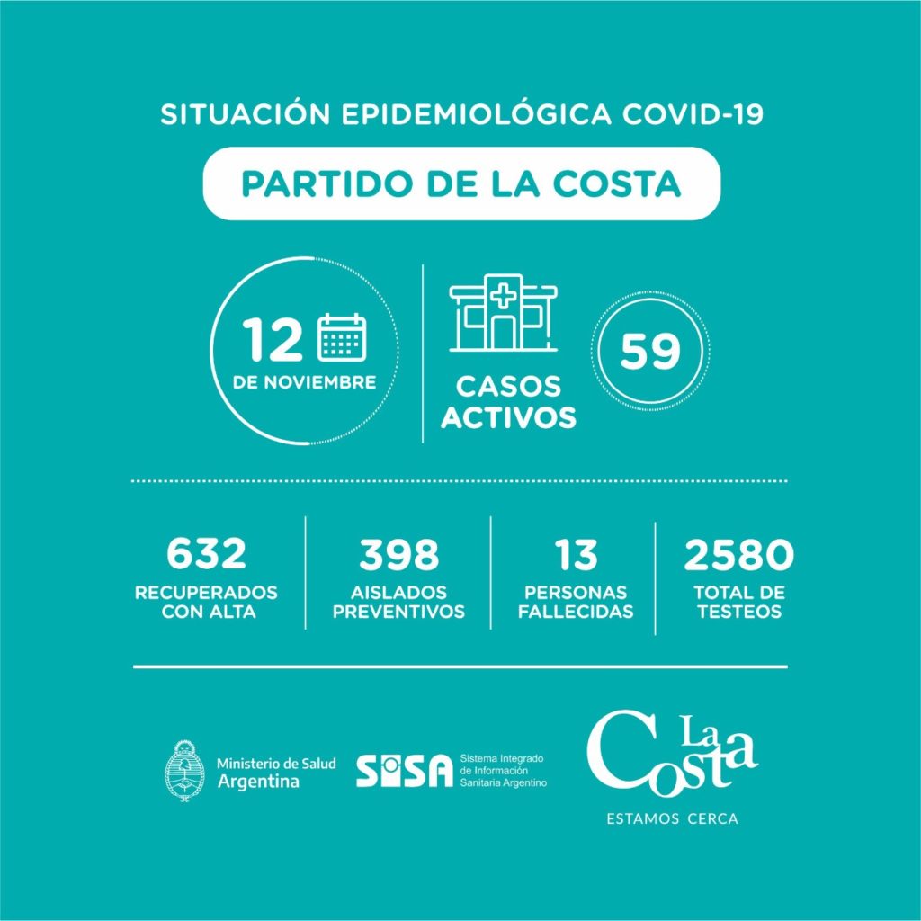 Este jueves 12 de noviembre se han recuperado otros 16 vecinos y vecinas de Covid-19 en el Partido de La Costa. Se recibieron resultados de un total de 48 testeos, de los cuales 32 son negativos y 16 son positivos.