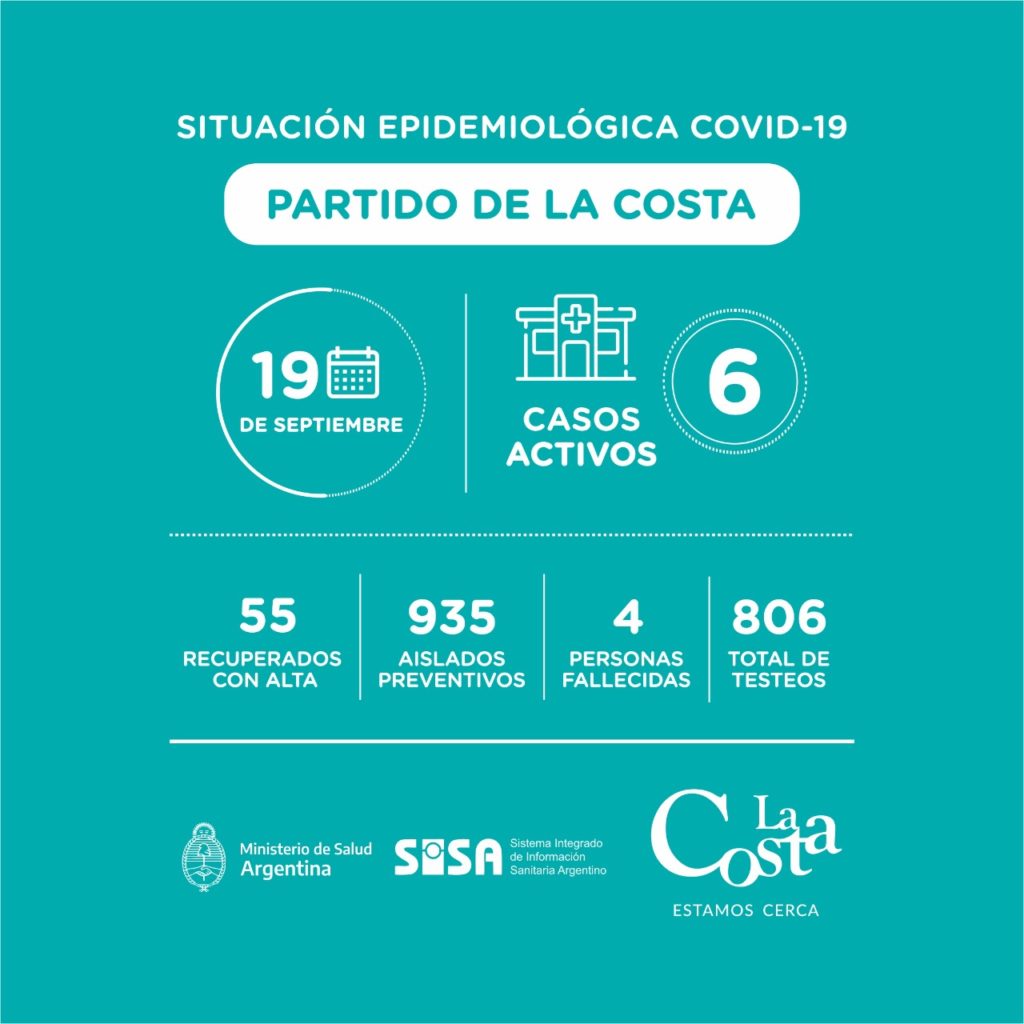 Recordamos que al día de hoy tenemos 6 casos activos entre los 100.000 habitantes del Partido de La Costa y que suman 55 los costeros y costeras con alta médica.