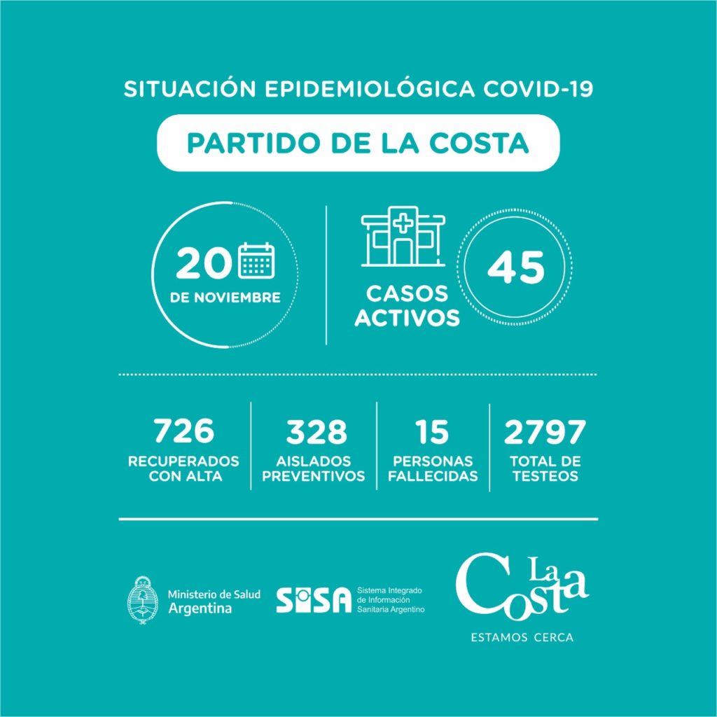 Este viernes 20 noviembre se han recuperado otros 7 vecinos y vecinas de Covid-19 en el Partido de La Costa. Se recibieron resultados de un total de 31 testeos, de los cuales 22 son negativos y 9 son positivos.