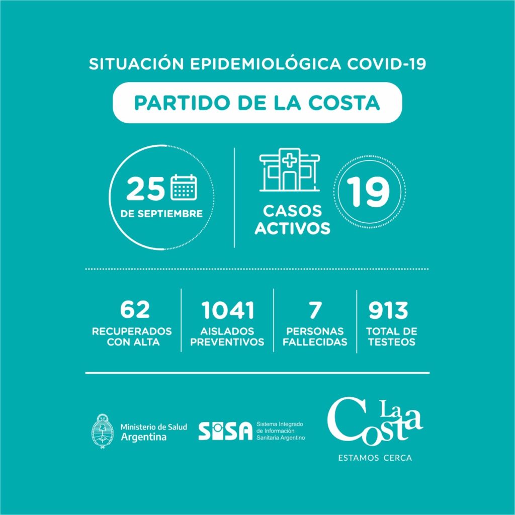En definitiva, hoy tenemos entonces 19 casos activos entre los 100.000 habitantes del Partido de La Costa, y 62 vecinos y vecinas que ya han recibido el alta médica. Les insistimos en el pedido de responsabilidad individual y colectiva. Les recordamos otra vez que están totalmente prohibidas las reuniones sociales, que son principales focos de contagios.