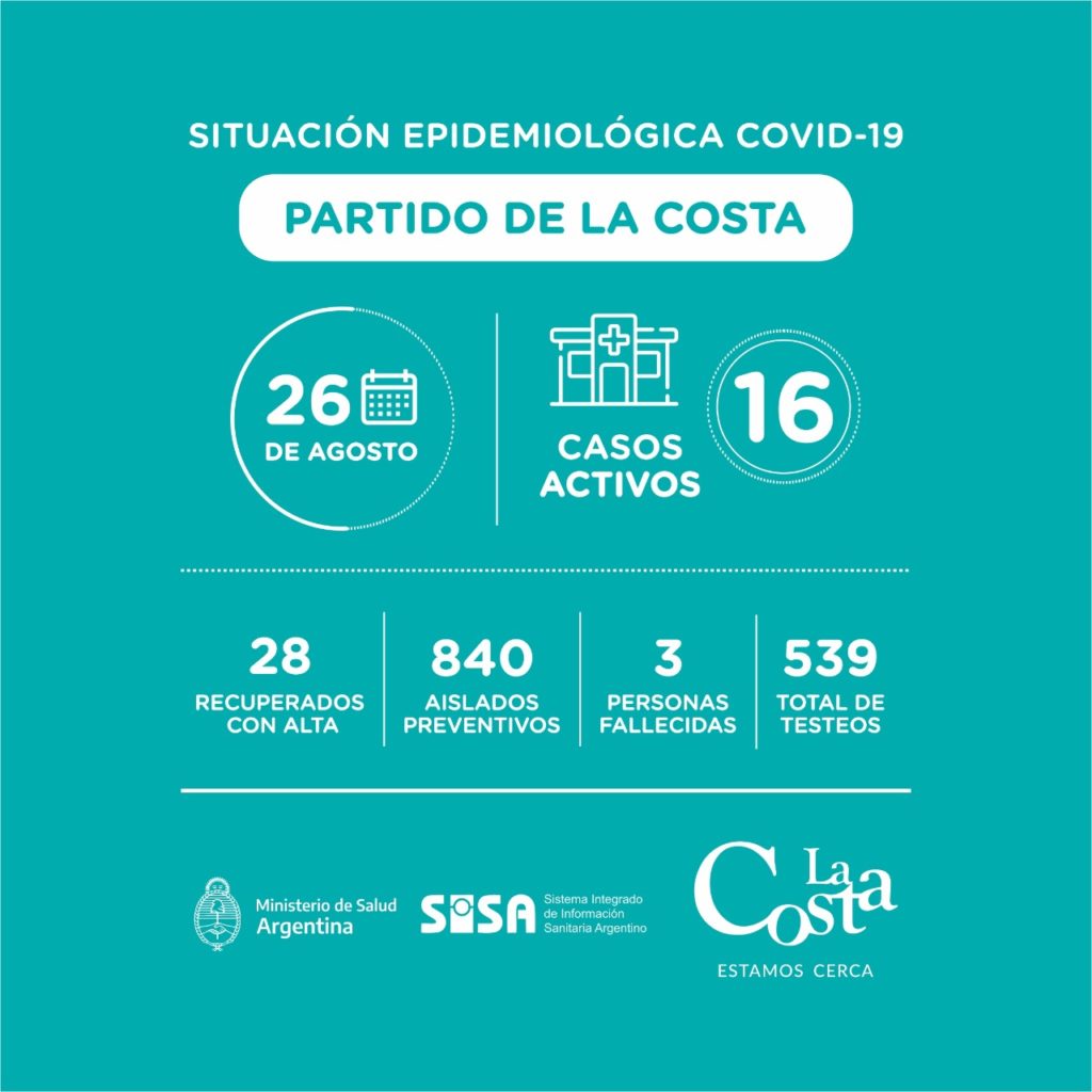 En La Costa tenemos al día de hoy 16 casos activos y 28 vecinos que recibieron el alta médica. Volvemos a apelar a la responsabilidad individual y pedir también que evitemos salir del Partido de La Costa, ya que el virus se expande de manera rápida y somos nosotros los que lo trasladamos.