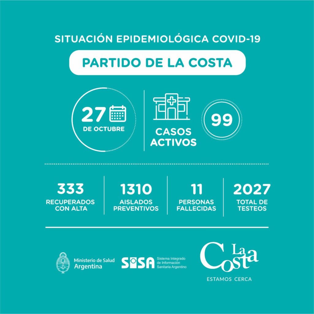 > Este martes 27 de octubre se han recuperado otros 19 vecinos y vecinas de Covid-19 en el Partido de La Costa. Además, se recibieron resultados de un total de 77 testeos, de los cuales 57 son negativos y 20 son positivos.
