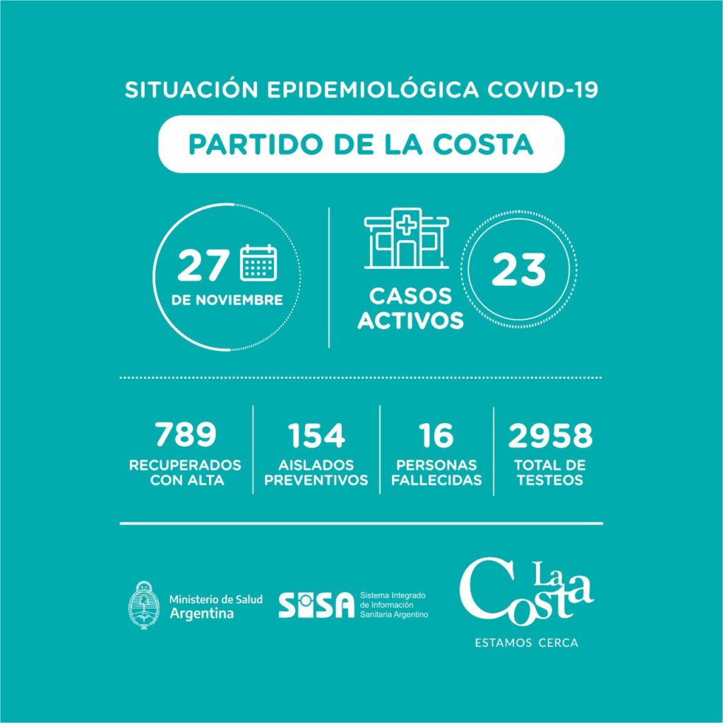 Este viernes 27 de noviembre se han recuperado otros 9 vecinos y vecinas de Covid-19 en el Partido de La Costa. Se recibieron resultados de un total de 22 testeos, de los cuales 14 son negativos y 8 positivos.