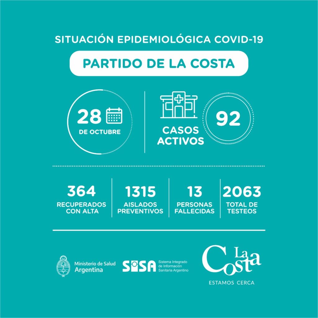 Este miércoles 28 de octubre se han recuperado otros 31 vecinos y vecinas de Covid-19 en el Partido de La Costa. Además, se recibieron resultados de un total de 79 testeos, de los cuales 53 son negativos y 26 son positivos. Se tratan de resultados de hisopados realizados por el Comité Epidemiológico, los 3 Hospitales de La Costa y la continuidad del programa DetectAr.