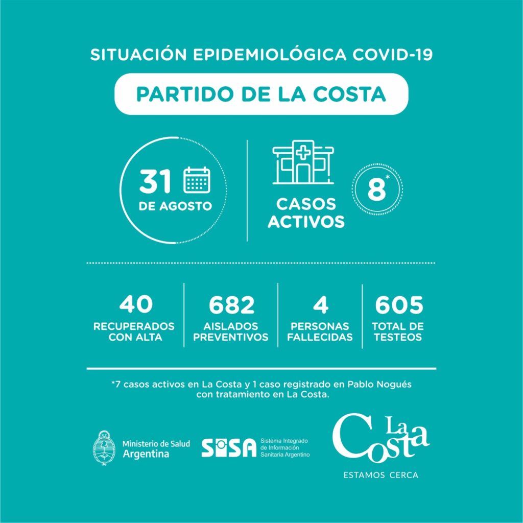 En el Partido de La Costa, entonces, tenemos al día de hoy 8 casos activos, 7 de ellos registrados en el distrito, y 1 en Pablo Nogués con tratamiento en La Costa. Sin bien las cifras, considerando nuestra cantidad de habitantes, son auspiciosas, insistimos con el pedido de la responsabilidad individual.